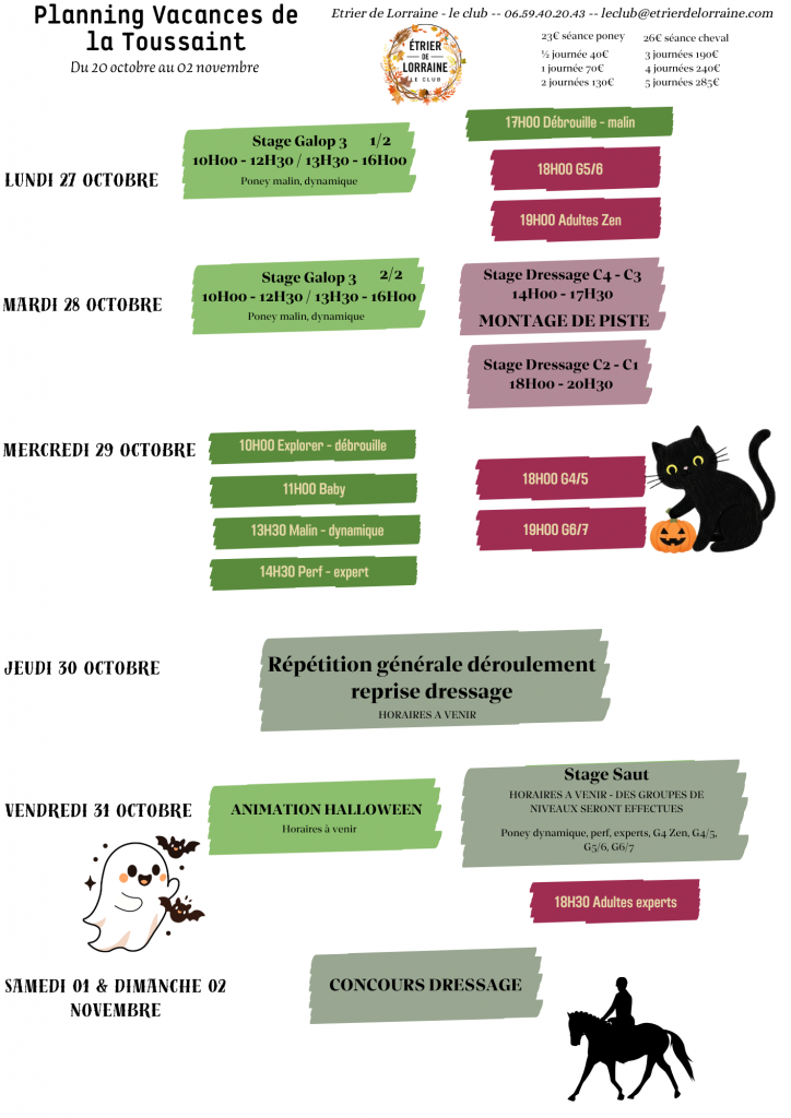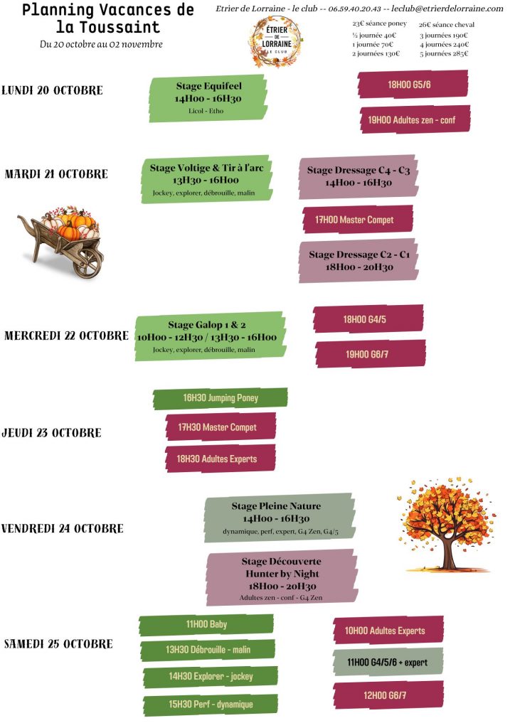 - GALOP 5 et + : stage 1 semaine dont passage examen*- vacances Toussaint – vacances d’été