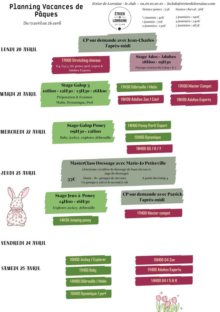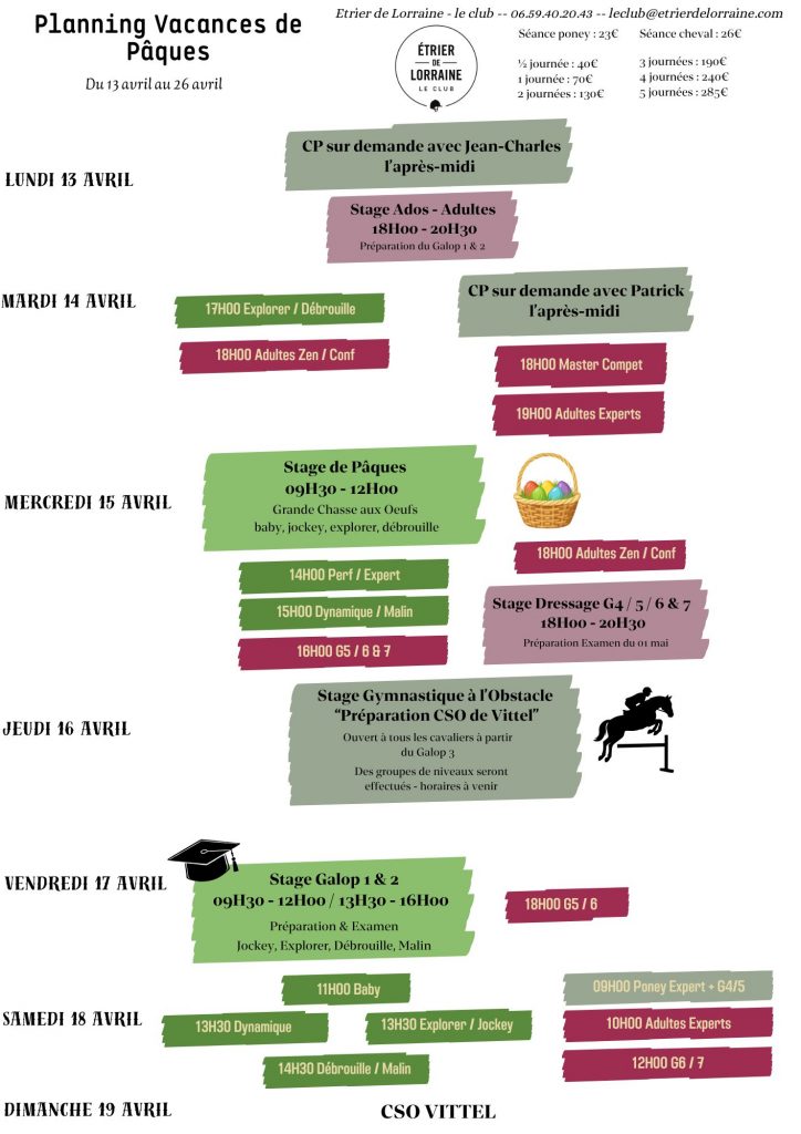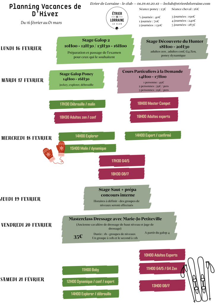 Afin de renforcer les connaissances transmises en reprises, des stages seront organisés à chaque vacance scolaire et permettront de passer ses galops. La durée des stages varie selon le niveau et l’âge du public.